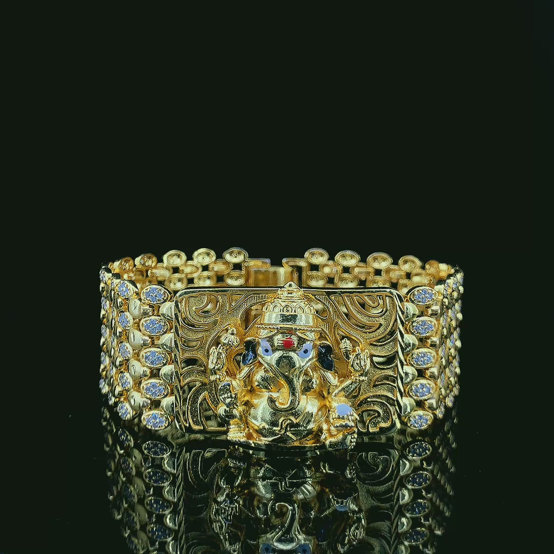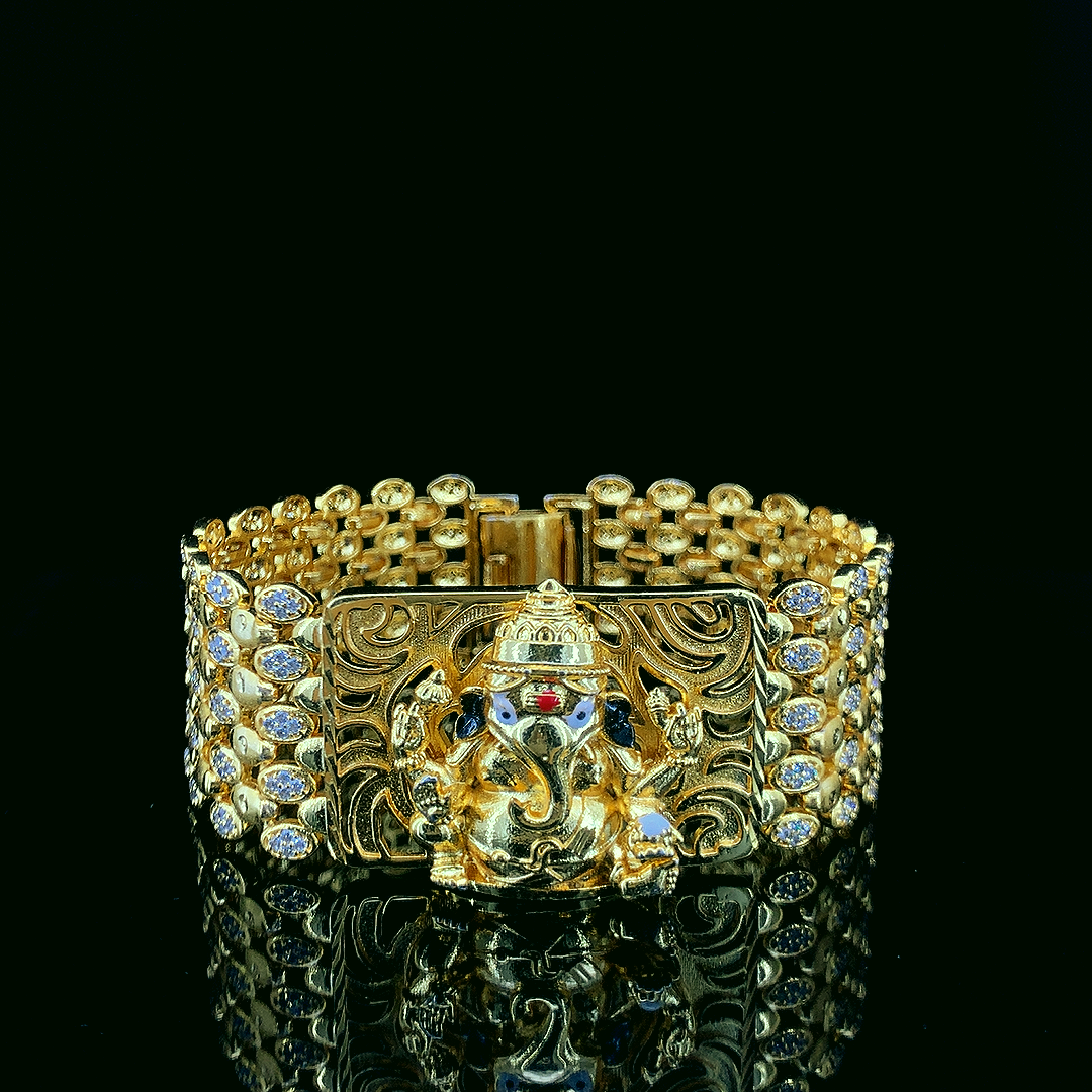 Majestic Gold Plated Bracelet with 3D Ganesh Murti and Diamond-Studded Mesh Design"