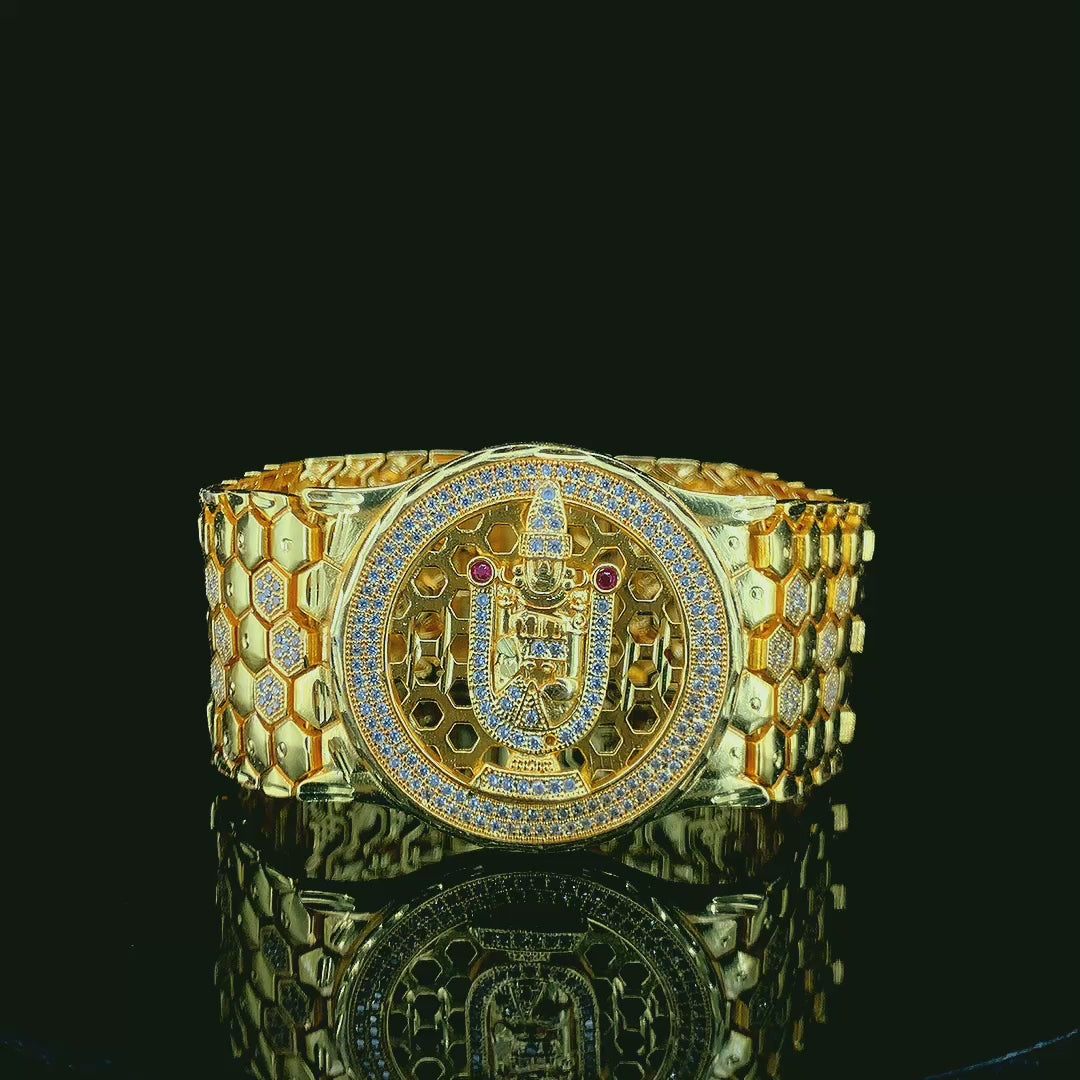 Luxury Tirupati God Gold Bracelet Watch with Diamond and Ruby Accents"