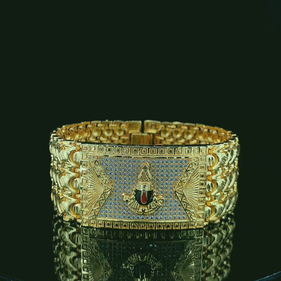 Elegant Tirupati god Gold Bracelet Watch with Textured Links and Royal Emblem Design"