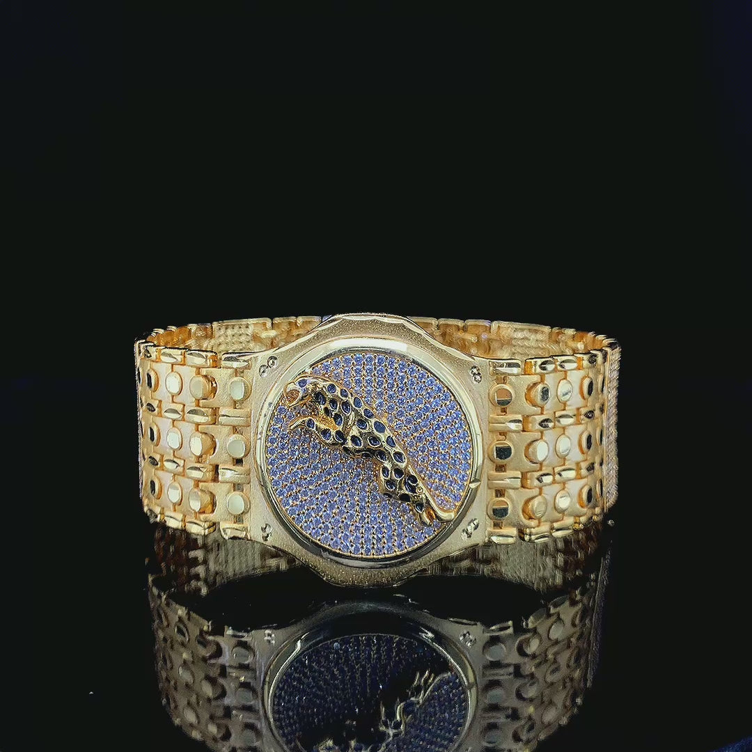 Gold Plated Bracelet with Diamond-Encrusted Cheetah Motif and Textured Link Design"