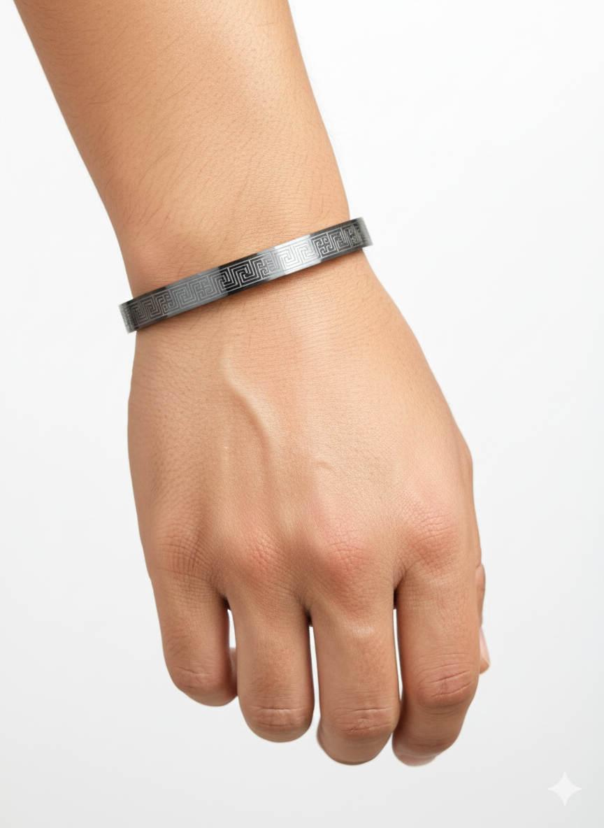 Men’s Gunmetal "Greek Key" Engraved Cuffs – Modern Meander Bracelet